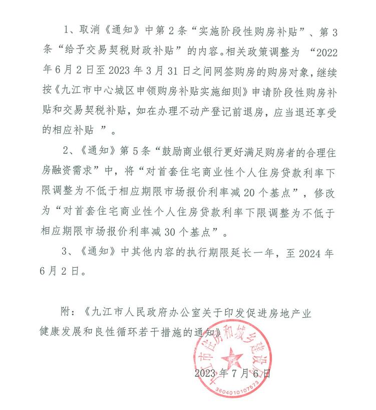 為繼續貫徹落實中央房地產調控政策,根據中央經濟工作會議“要因城施策,支持剛性和改善性住房需求,推動房地產業向新發展模式平穩過渡”精神,經2023年7月5日九江市人民政府市長辦公會第六次會議研究同意,現就調整和延長《通知》執行期限等事宜,公告如下: